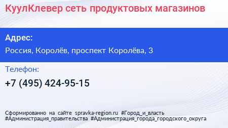 КуулКлевер, сеть продуктовых магазинов по адресу проспект Королёва, 3, 3, проспект Королёва, Новые Подлипки, Королёв, городской округ Королёв, Московская область, Центральный федеральный округ, 141077, Россия в дальнейшем Организация, размещена в следующих категориях: