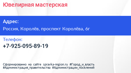 Ювелирная мастерская по адресу Торговый центр "Ковчег", 6А, проспект Королёва, Новые Подлипки, Королёв, городской округ Королёв, Московская область, Центральный федеральный округ, 141077, Россия в дальнейшем Организация, размещена в следующих категориях: