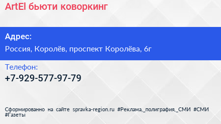 ArtEl, бьюти-коворкинг по адресу Торговый центр "Ковчег", 6А, проспект Королёва, Новые Подлипки, Королёв, городской округ Королёв, Московская область, Центральный федеральный округ, 141077, Россия в дальнейшем Организация, размещена в следующих категориях: