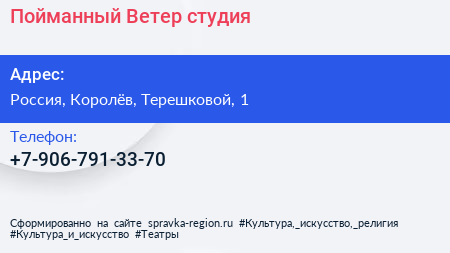 Пойманный Ветер, студия по адресу Дворец культуры им. Калинина, 1, улица Терешковой, Подлипки, Королёв, городской округ Королёв, Московская область, Центральный федеральный округ, 141070, Россия в дальнейшем Организация, размещена в следующих категориях: