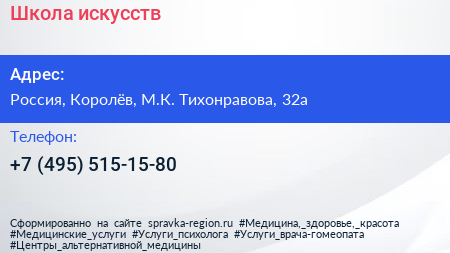 Школа искусств по адресу Детская школа искусств, 32А, улица Тихонравова, Юбилейный, Королёв, городской округ Королёв, Московская область, Центральный федеральный округ, 141092, Россия в дальнейшем Организация, размещена в следующих категориях: