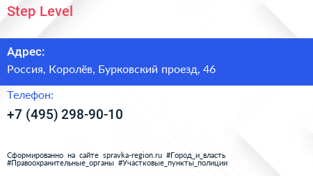 Step & Level по адресу Гимназия «Российская школа», Полевая улица, Жилой квартал «Театральный парк», Бурково, Королёв, городской округ Королёв, Московская область, Центральный федеральный округ, 141065, Россия в дальнейшем Организация, размещена в следующих категориях: