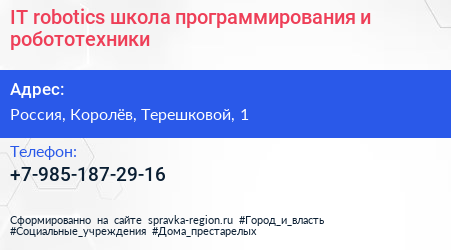 IT robotics, школа программирования и робототехники по адресу Дворец культуры им. Калинина, 1, улица Терешковой, Подлипки, Королёв, городской округ Королёв, Московская область, Центральный федеральный округ, 141070, Россия в дальнейшем Организация, размещена в следующих категориях: