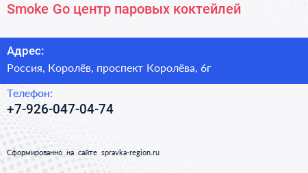 Smoke & Go, центр паровых коктейлей по адресу Торговый центр "Ковчег", 6А, проспект Королёва, Новые Подлипки, Королёв, городской округ Королёв, Московская область, Центральный федеральный округ, 141077, Россия в дальнейшем Организация, размещена в следующих категориях: