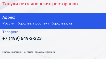 Тануки, сеть японских ресторанов по адресу Торговый центр "Ковчег", 6А, проспект Королёва, Новые Подлипки, Королёв, городской округ Королёв, Московская область, Центральный федеральный округ, 141077, Россия в дальнейшем Организация, размещена в следующих категориях: