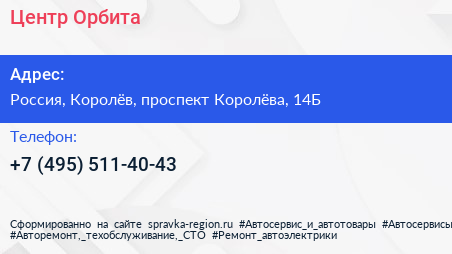 Центр Орбита по адресу Центр внешкольной работы, 14Б, проспект Королёва, Новые Подлипки, Королёв, городской округ Королёв, Московская область, Центральный федеральный округ, 141077, Россия в дальнейшем Организация, размещена в следующих категориях: