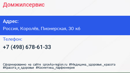 Домжилсервис по адресу УК ДомЖилСервис, 30 к6, Пионерская улица, Новые Подлипки, Королёв, городской округ Королёв, Московская область, Центральный федеральный округ, 141074, Россия в дальнейшем Организация, размещена в следующих категориях: