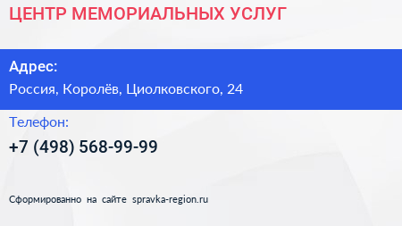 ЦЕНТР МЕМОРИАЛЬНЫХ УСЛУГ по адресу Центральная Городская больница, улица Циолковского, Комитетский Лес, Королёв, городской округ Королёв, Московская область, Центральный федеральный округ, 141070, Россия в дальнейшем Организация, размещена в следующих категориях: