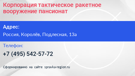 Корпорация тактическое ракетное вооружение, пансионат по адресу Пансионат с лечением КТРВ, 13А, Подлесная улица, Костино, Королёв, городской округ Королёв, Московская область, Центральный федеральный округ, 141071, Россия в дальнейшем Организация, размещена в следующих категориях: