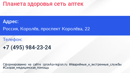 Планета здоровья, сеть аптек по адресу Планета здоровья, 22, проспект Королёва, Новые Подлипки, Королёв, городской округ Королёв, Московская область, Центральный федеральный округ, 141077, Россия в дальнейшем Организация, размещена в следующих категориях: