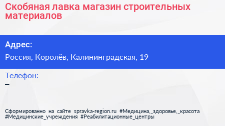 Скобяная лавка, магазин строительных материалов по адресу Скобяная лавка, 19, Калининградская улица, Новые Подлипки, Королёв, городской округ Королёв, Московская область, Центральный федеральный округ, 141078, Россия в дальнейшем Организация, размещена в следующих категориях: