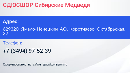 СДЮСШОР Сибирские Медведи по адресу 629320, Ямало-Ненецкий АО, Коротчаево, Октябрьская, 22 в дальнейшем Организация, размещена в следующих категориях: