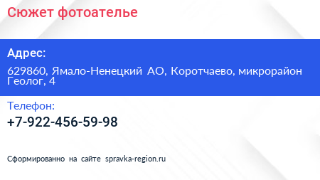 Сюжет, фотоателье по адресу 629860, Ямало-Ненецкий АО, Коротчаево, микрорайон Геолог, 4 в дальнейшем Организация, размещена в следующих категориях: