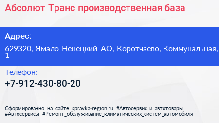 Абсолют Транс, производственная база по адресу 629320, Ямало-Ненецкий АО, Коротчаево, Коммунальная, 1 в дальнейшем Организация, размещена в следующих категориях: