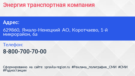 Энергия, транспортная компания по адресу 629860, Ямало-Ненецкий АО, Коротчаево, 1-й микрорайон, 6а в дальнейшем Организация, размещена в следующих категориях: