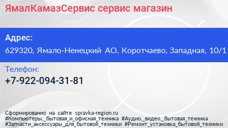 ЯмалКамазСервис, сервис-магазин по адресу 629320, Ямало-Ненецкий АО, Коротчаево, Западная, 10/1 в дальнейшем Организация, размещена в следующих категориях: