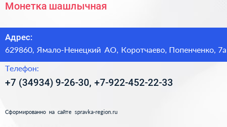 Монетка, шашлычная по адресу 629860, Ямало-Ненецкий АО, Коротчаево, Попенченко, 7а в дальнейшем Организация, размещена в следующих категориях:
