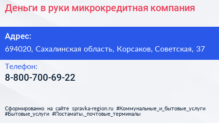 Деньги в руки, микрокредитная компания по адресу 694020, Сахалинская область, Корсаков, Советская, 37 в дальнейшем Организация, размещена в следующих категориях: