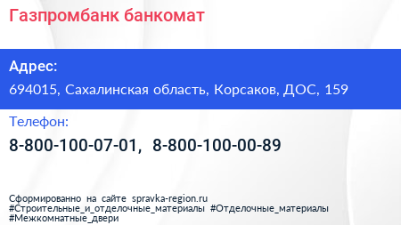 Газпромбанк, банкомат по адресу 694015, Сахалинская область, Корсаков, ДОС, 159 в дальнейшем Организация, размещена в следующих категориях: