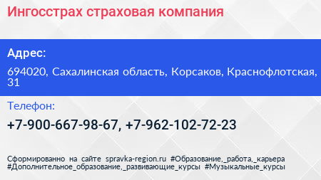 Ингосстрах, страховая компания по адресу 694020, Сахалинская область, Корсаков, Краснофлотская, 31 в дальнейшем Организация, размещена в следующих категориях: