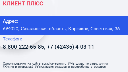 КЛИЕНТ ПЛЮС по адресу 694020, Сахалинская область, Корсаков, Советская, 36 в дальнейшем Организация, размещена в следующих категориях: