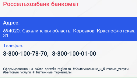 Россельхозбанк, банкомат по адресу 694020, Сахалинская область, Корсаков, Краснофлотская, 31 в дальнейшем Организация, размещена в следующих категориях: