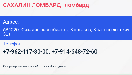 САХАЛИН ЛОМБАРД+, ломбард по адресу 694020, Сахалинская область, Корсаков, Краснофлотская, 31а в дальнейшем Организация, размещена в следующих категориях: