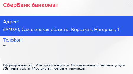 СберБанк, банкомат по адресу 694020, Сахалинская область, Корсаков, Нагорная, 1 в дальнейшем Организация, размещена в следующих категориях: