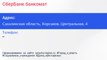 СберБанк, банкомат по адресу Сахалинская область, Корсаков, Центральная, 4 в дальнейшем Организация, размещена в следующих категориях: