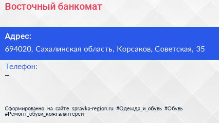 Восточный, банкомат по адресу 694020, Сахалинская область, Корсаков, Советская, 35 в дальнейшем Организация, размещена в следующих категориях: