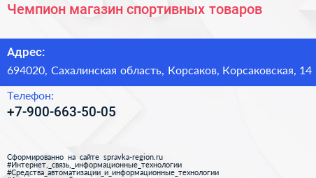 Чемпион, магазин спортивных товаров по адресу 694020, Сахалинская область, Корсаков, Корсаковская, 14 в дальнейшем Организация, размещена в следующих категориях:
