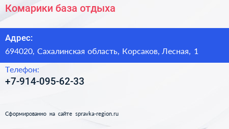 Комарики, база отдыха по адресу 694020, Сахалинская область, Корсаков, Лесная, 1 в дальнейшем Организация, размещена в следующих категориях: