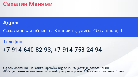 Сахалин Майями по адресу Сахалинская область, Корсаков, улица Океанская, 1 в дальнейшем Организация, размещена в следующих категориях: