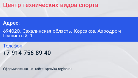 Центр технических видов спорта по адресу 694020, Сахалинская область, Корсаков, Аэродром Пушистый, 1 в дальнейшем Организация, размещена в следующих категориях: