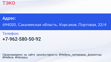 ТЭКО по адресу 694020, Сахалинская область, Корсаков, Портовая, 22/4 в дальнейшем Организация, размещена в следующих категориях: