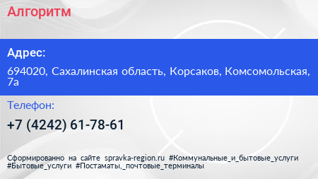 Алгоритм по адресу 694020, Сахалинская область, Корсаков, Комсомольская, 7а в дальнейшем Организация, размещена в следующих категориях: