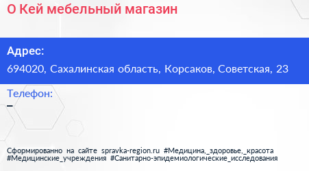 О`Кей, мебельный магазин по адресу 694020, Сахалинская область, Корсаков, Советская, 23 в дальнейшем Организация, размещена в следующих категориях: