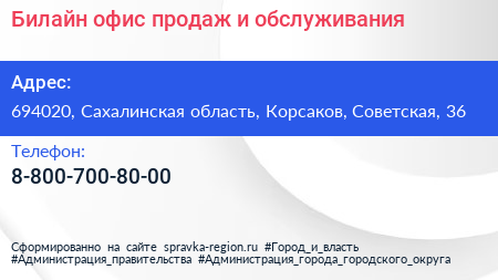 Билайн, офис продаж и обслуживания по адресу 694020, Сахалинская область, Корсаков, Советская, 36 в дальнейшем Организация, размещена в следующих категориях: