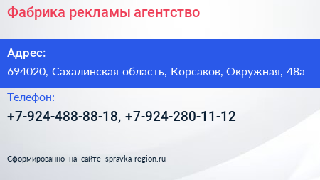 Фабрика рекламы, агентство по адресу 694020, Сахалинская область, Корсаков, Окружная, 48а в дальнейшем Организация, размещена в следующих категориях: