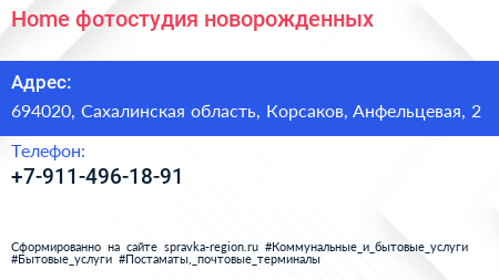 Home, фотостудия новорожденных по адресу 694020, Сахалинская область, Корсаков, Анфельцевая, 2 в дальнейшем Организация, размещена в следующих категориях: