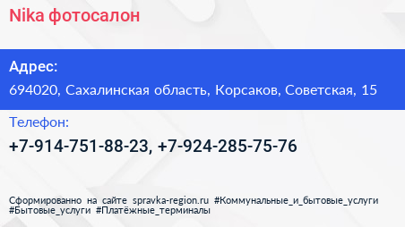 Nika, фотосалон по адресу 694020, Сахалинская область, Корсаков, Советская, 15 в дальнейшем Организация, размещена в следующих категориях: