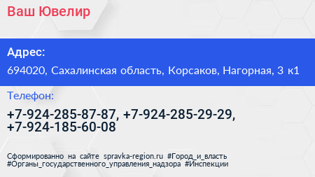 Ваш Ювелир по адресу 694020, Сахалинская область, Корсаков, Нагорная, 3 к1 в дальнейшем Организация, размещена в следующих категориях: