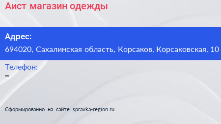 Аист, магазин одежды по адресу 694020, Сахалинская область, Корсаков, Корсаковская, 10 в дальнейшем Организация, размещена в следующих категориях: