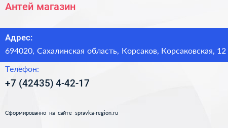 Антей, магазин по адресу 694020, Сахалинская область, Корсаков, Корсаковская, 12 в дальнейшем Организация, размещена в следующих категориях: