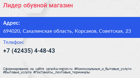Лидер, обувной магазин по адресу 694020, Сахалинская область, Корсаков, Советская, 23 в дальнейшем Организация, размещена в следующих категориях: