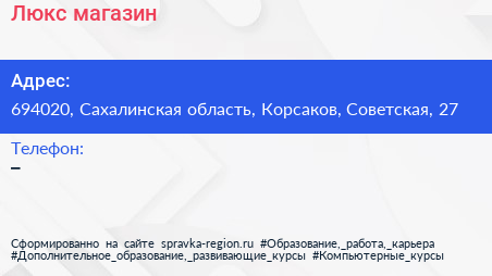 Люкс, магазин по адресу 694020, Сахалинская область, Корсаков, Советская, 27 в дальнейшем Организация, размещена в следующих категориях: