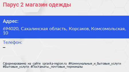 Парус 2, магазин одежды по адресу 694020, Сахалинская область, Корсаков, Комсомольская, 10 в дальнейшем Организация, размещена в следующих категориях:
