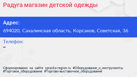 Радуга, магазин детской одежды по адресу 694020, Сахалинская область, Корсаков, Советская, 36 в дальнейшем Организация, размещена в следующих категориях: