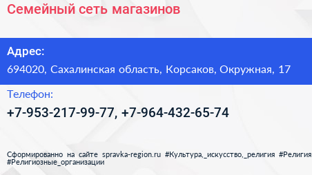 Семейный, сеть магазинов по адресу 694020, Сахалинская область, Корсаков, Окружная, 17 в дальнейшем Организация, размещена в следующих категориях: