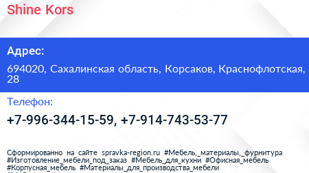 Shine.Kors по адресу 694020, Сахалинская область, Корсаков, Краснофлотская, 28 в дальнейшем Организация, размещена в следующих категориях: